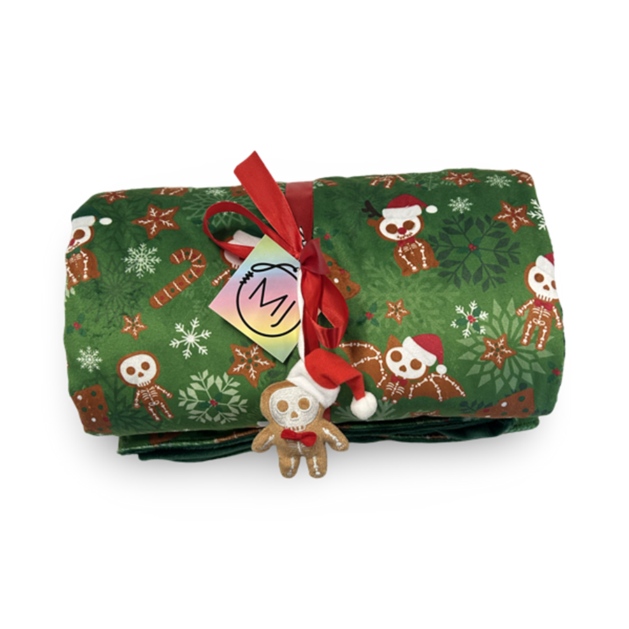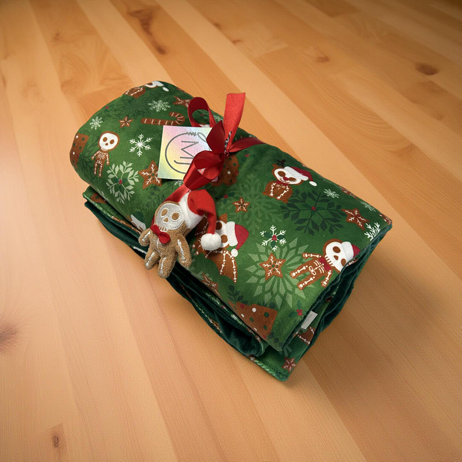 Cozy up this holiday season with a hauntingly festive throw blanket. Our popular Gingerdead print now available in a fun new color! A deep emerald green for a classic Christmas vibe but with a dark twist. This super soft minky blanket is great for lounging or adding a touch of delightful dread to your home decor.